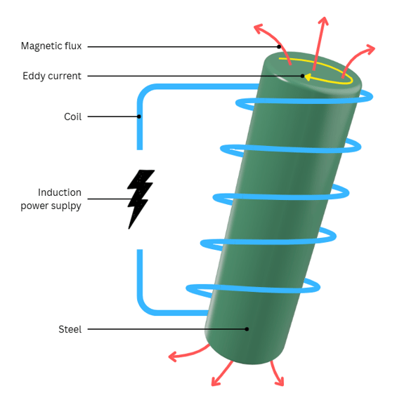 First, in the induction‑heating stage, an alternating current passes through a copper coil surrounding the part. The current generates a magnetic field that induces eddy currents in the surface of the part; the steel’s electrical resistance turns the eddy currents into heat until the metal’s surface is brought into the austenite range.